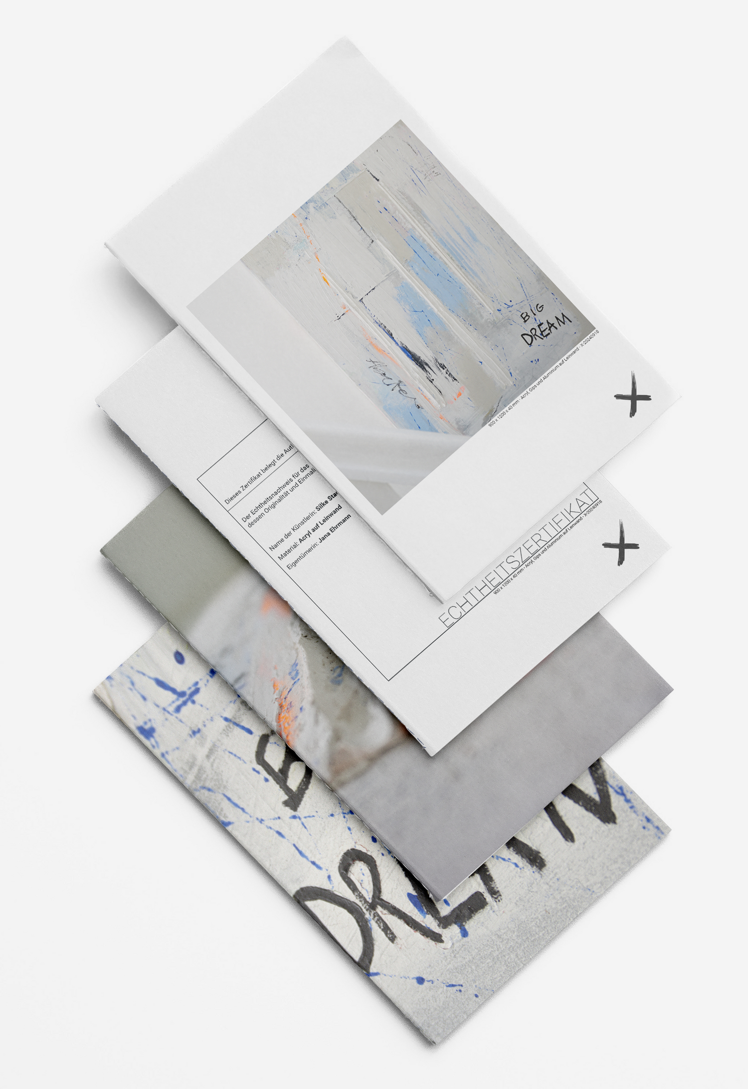 Zu jedem Werk erhältst du ein Echtheitszertifikat mit Titel, Datum, Technik und Signatur. So weißt du immer: Das Stück ist original und gehört einzig dir.
