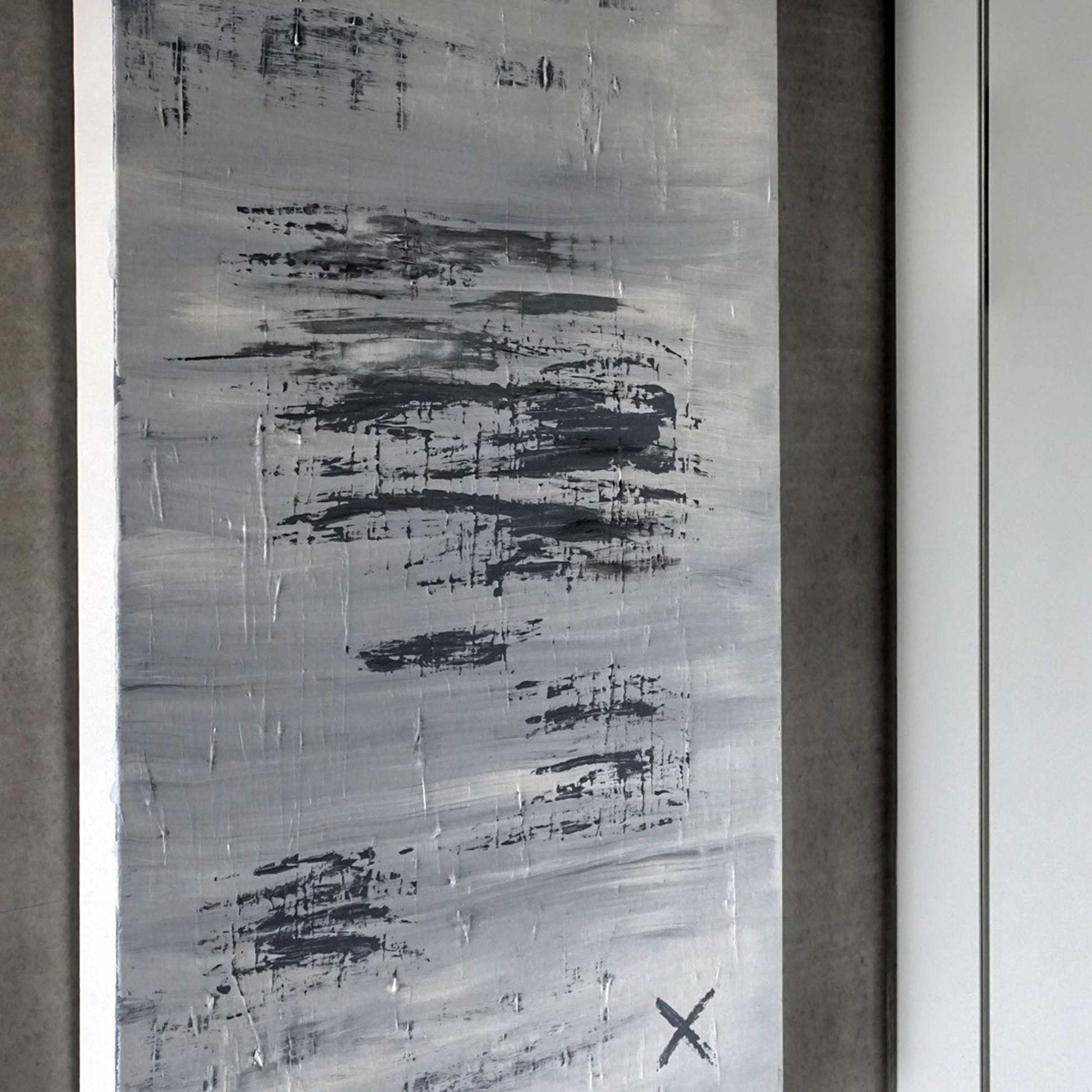 Minimalistisch und kraftvoll: Dunkle, horizontale Strukturen ziehen sich über eine graue Fläche, wie verwischte Spuren oder Erinnerungen. Ein Werk, das Ruhe, Tiefe und Reduktion in einem klaren Ausdruck vereint.