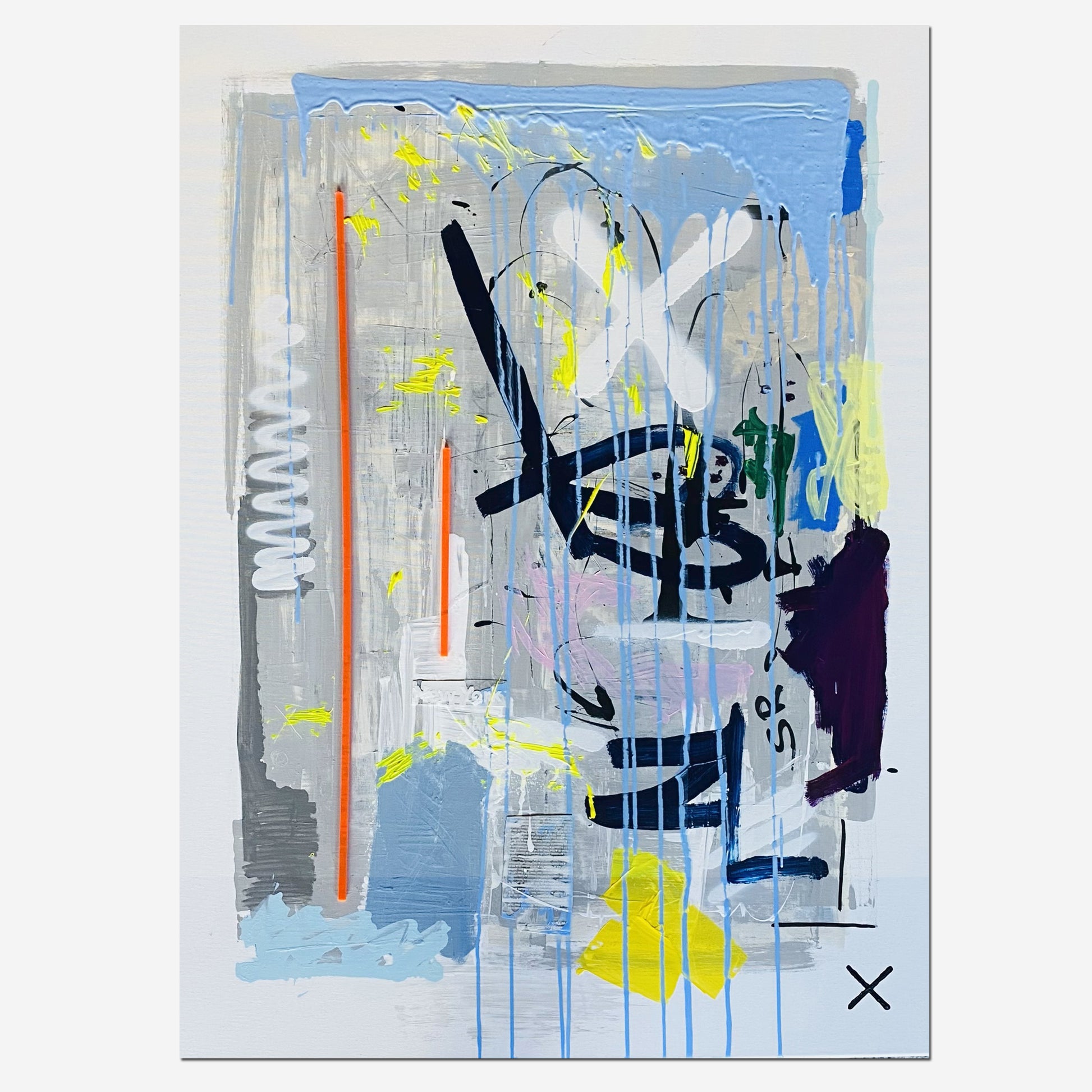 Ein Werk zwischen Malerei und Grafik: Über einer grauen, strukturierten Fläche entfalten sich schwarze kalligrafische Gesten, ergänzt durch ein leuchtendes Neon-Orange, Gelb und Weiß. Blaue Tropfspuren und klare Flächen in Gelb und Lila sorgen für Dynamik. Das große schwarze „X“ unten rechts betont die Klarheit und Symbolik. Ein Bild voller Kontraste – kraftvoll, reduziert und modern.