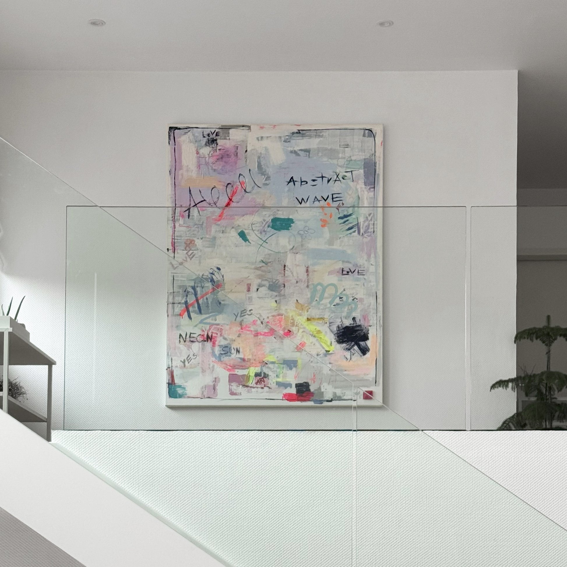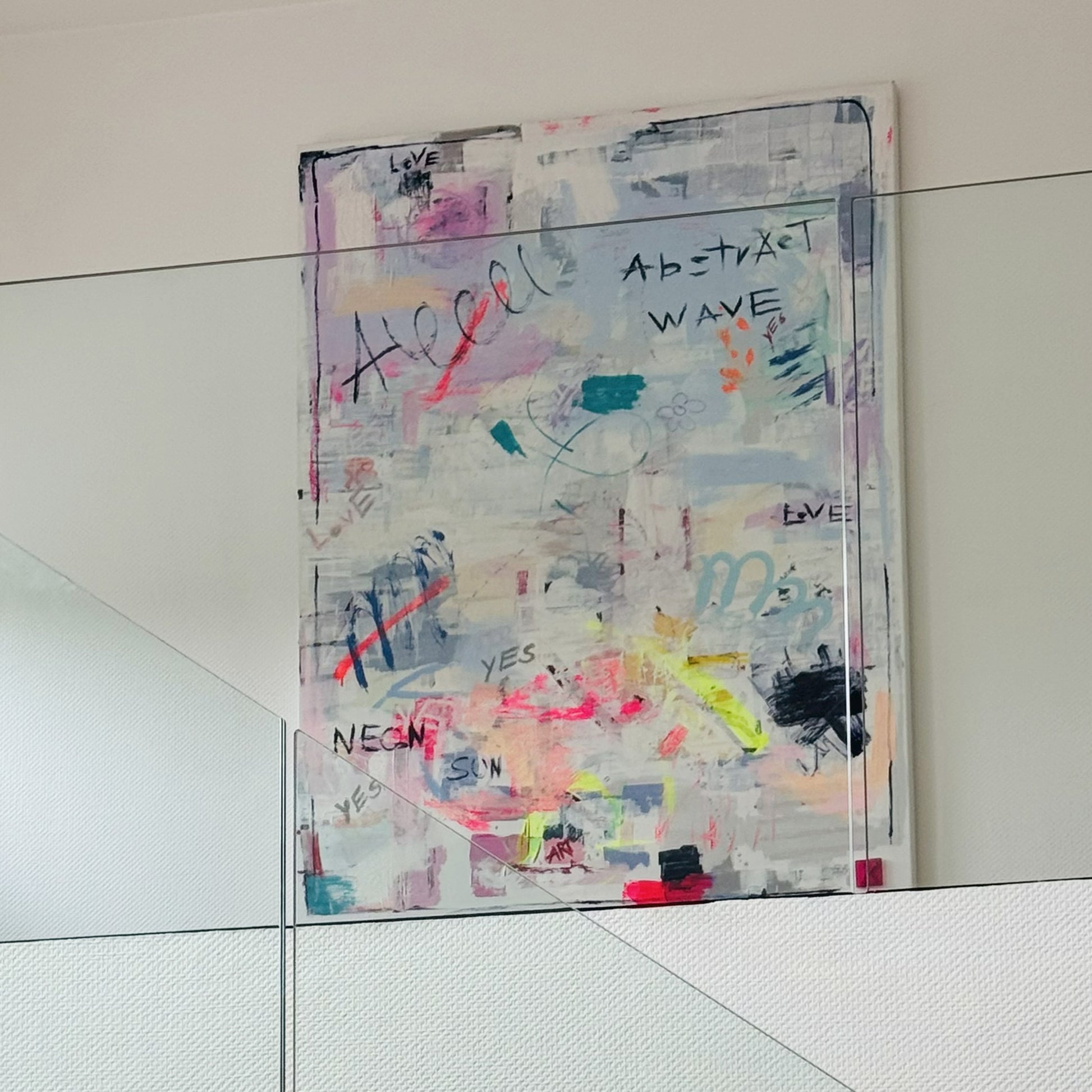 Ein verspieltes, vielschichtiges Gemälde: Auf einer hellen, fast transparenten Basis überlagern sich pastellige Flächen in Rosa, Blau und Grün mit handschriftlichen Worten wie LOVE, ABSTRACT WAVE und YES. Neonfarbene Akzente durchbrechen die ruhige Grundstimmung und sorgen für Spannung. Freie Skizzen – Blumen, Zeichen, Symbole – verleihen dem Werk eine persönliche, fast tagebuchartige Note. Ein Bild, das Leichtigkeit, Spontaneität und urbane Energie ausstrahlt.