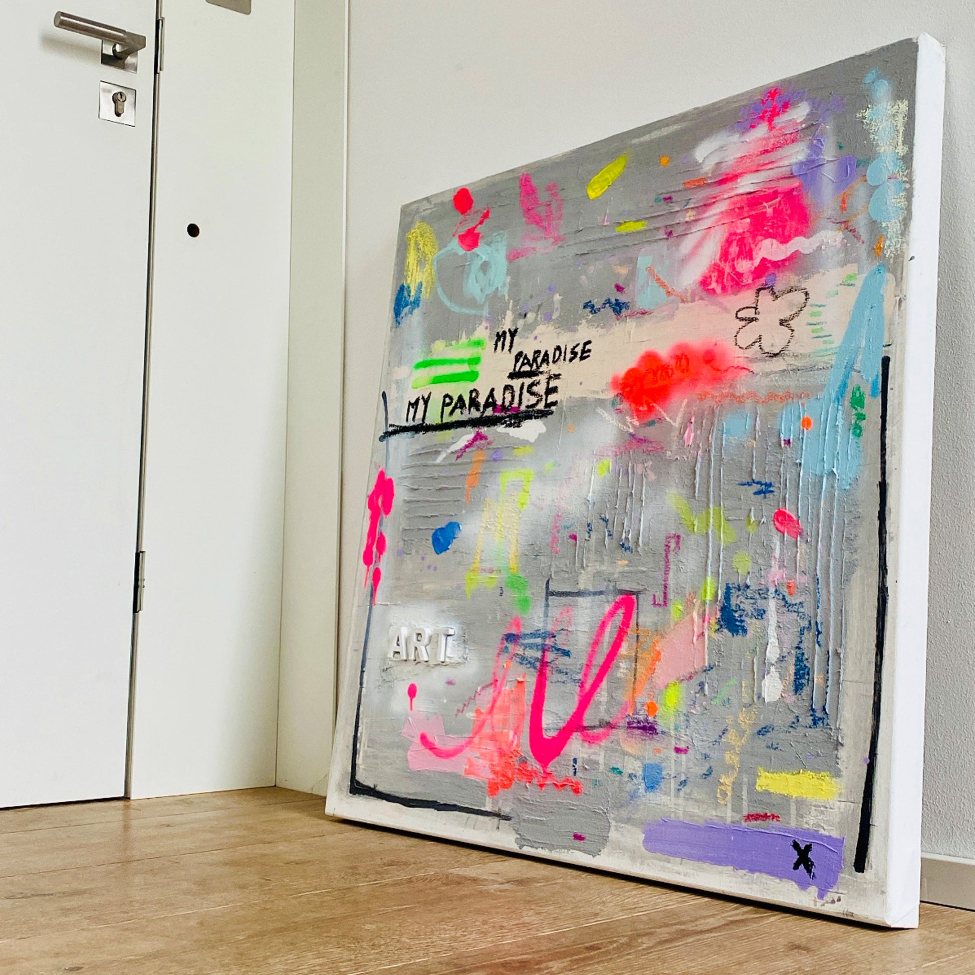 Ein energiegeladenes Werk, das urbane Street-Art-Elemente auf die Leinwand bringt. Auf einer silbrig-grauen Grundfläche leuchten kräftige Neonfarben in Pink, Grün, Gelb und Orange. Schriftzüge wie „MY PARADISE“ und „ART“ setzen klare Akzente, während verspielte Kritzeleien und Farbspuren dem Werk eine spontane, lebendige Ausstrahlung verleihen. Ein Bild voller Freiheit, Farbe und Ausdruckskraft – ein abstraktes Statement zwischen Kunst und urbanem Lifestyle.