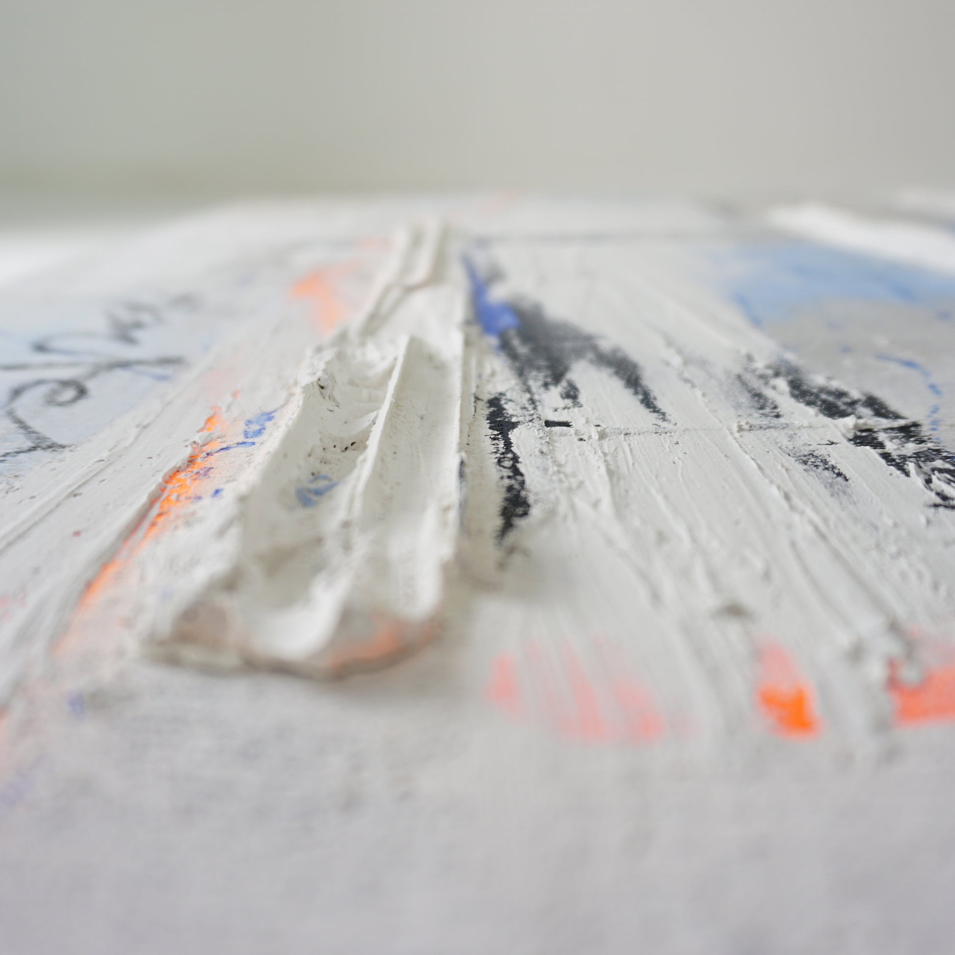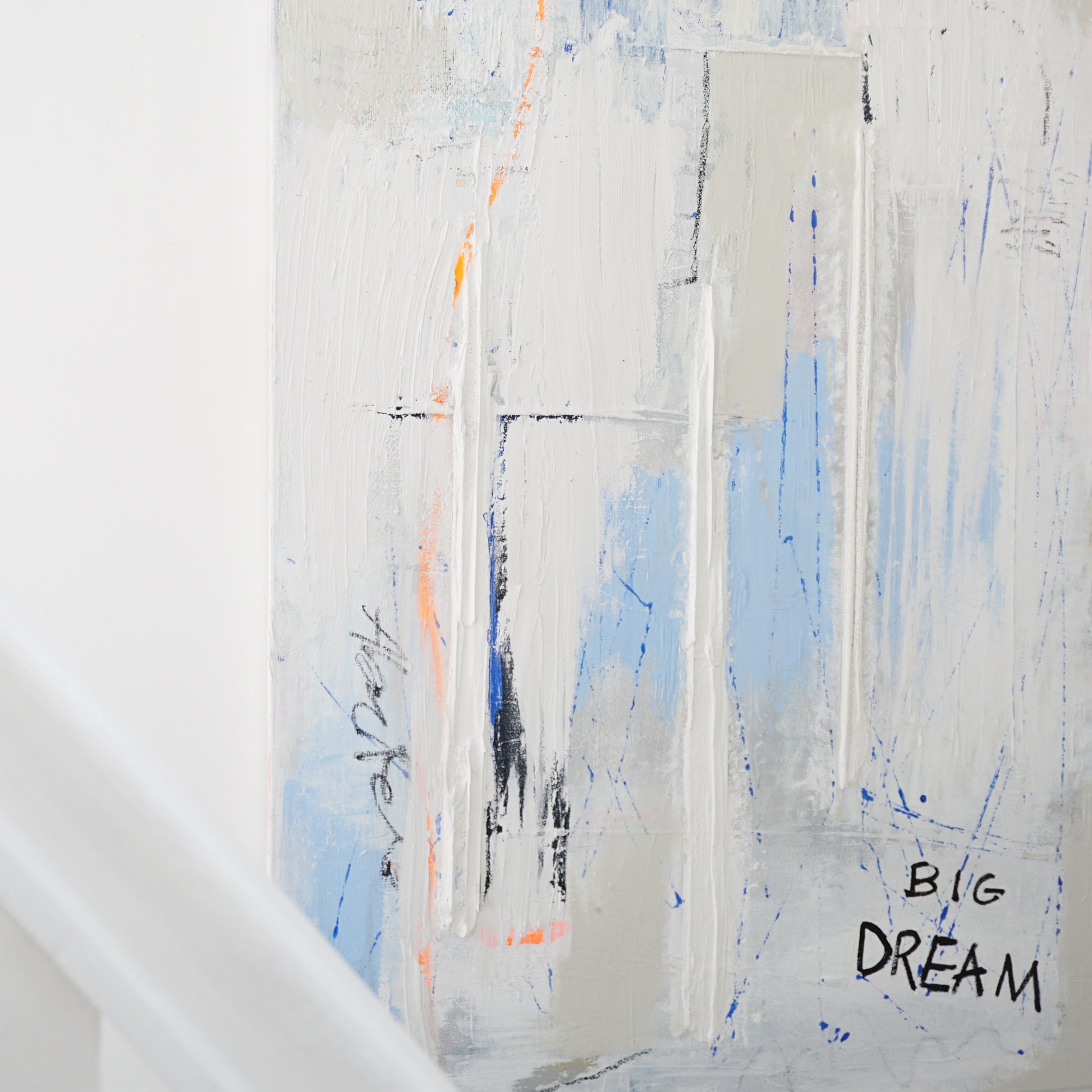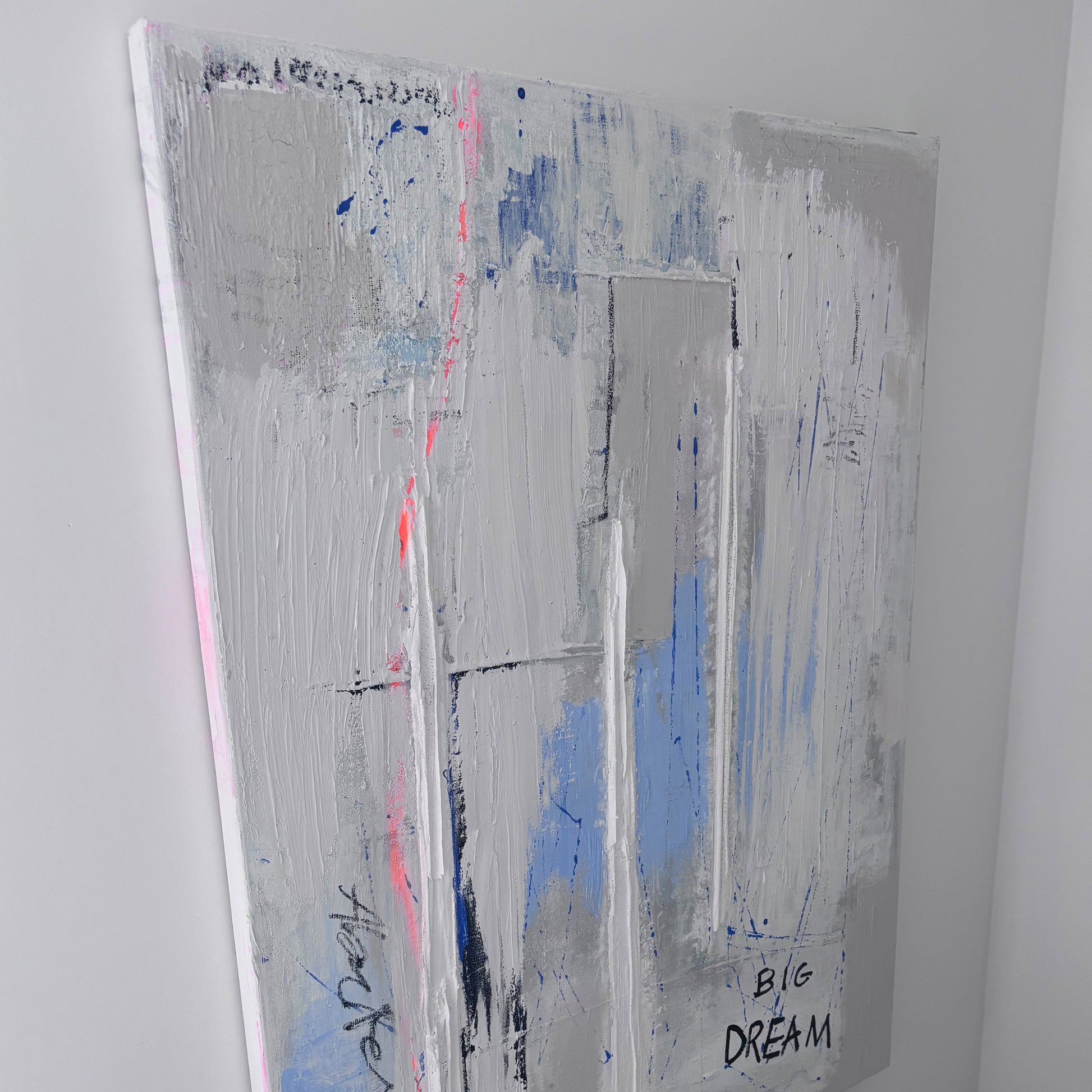 Ein harmonisches Zusammenspiel aus kühlen Blau- und Grautönen, durchzogen von leuchtenden Neonakzenten. Die starke, pastose Struktur schafft Tiefe und Bewegung. „BIG DREAM“ ist Botschaft und Einladung zugleich – ein abstraktes Tor zu Visionen und Möglichkeiten.