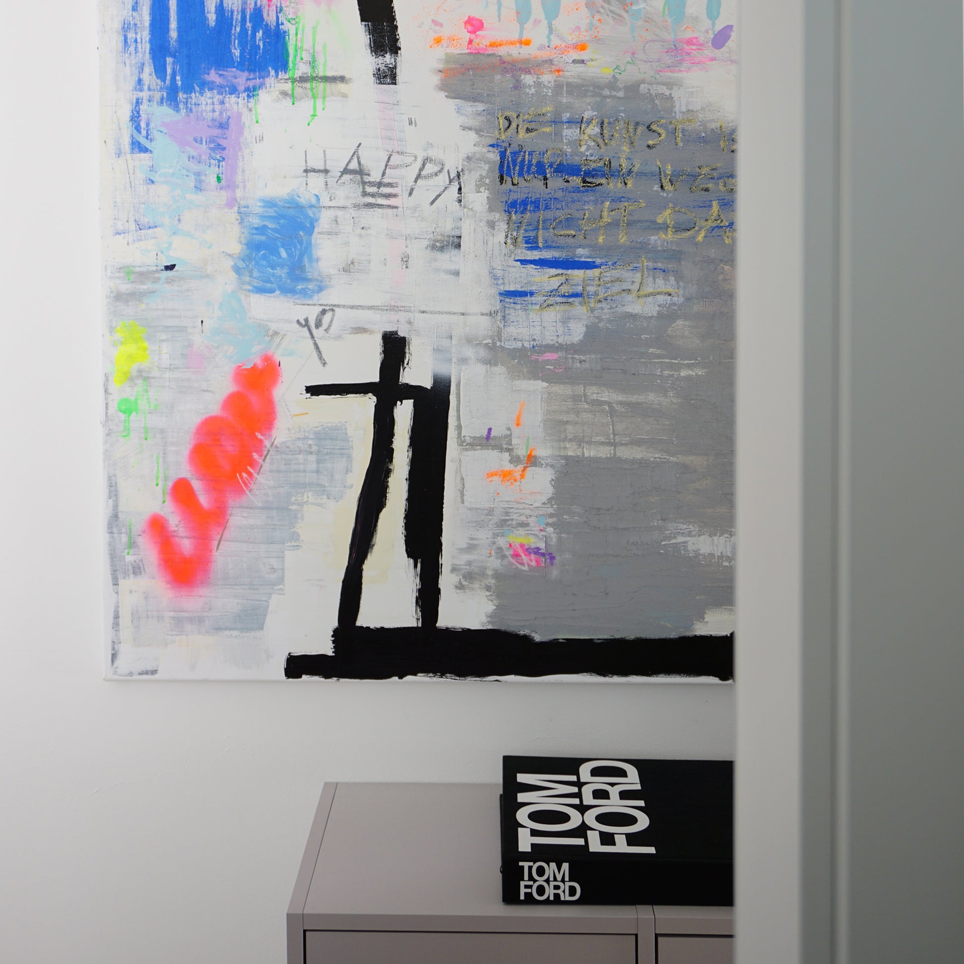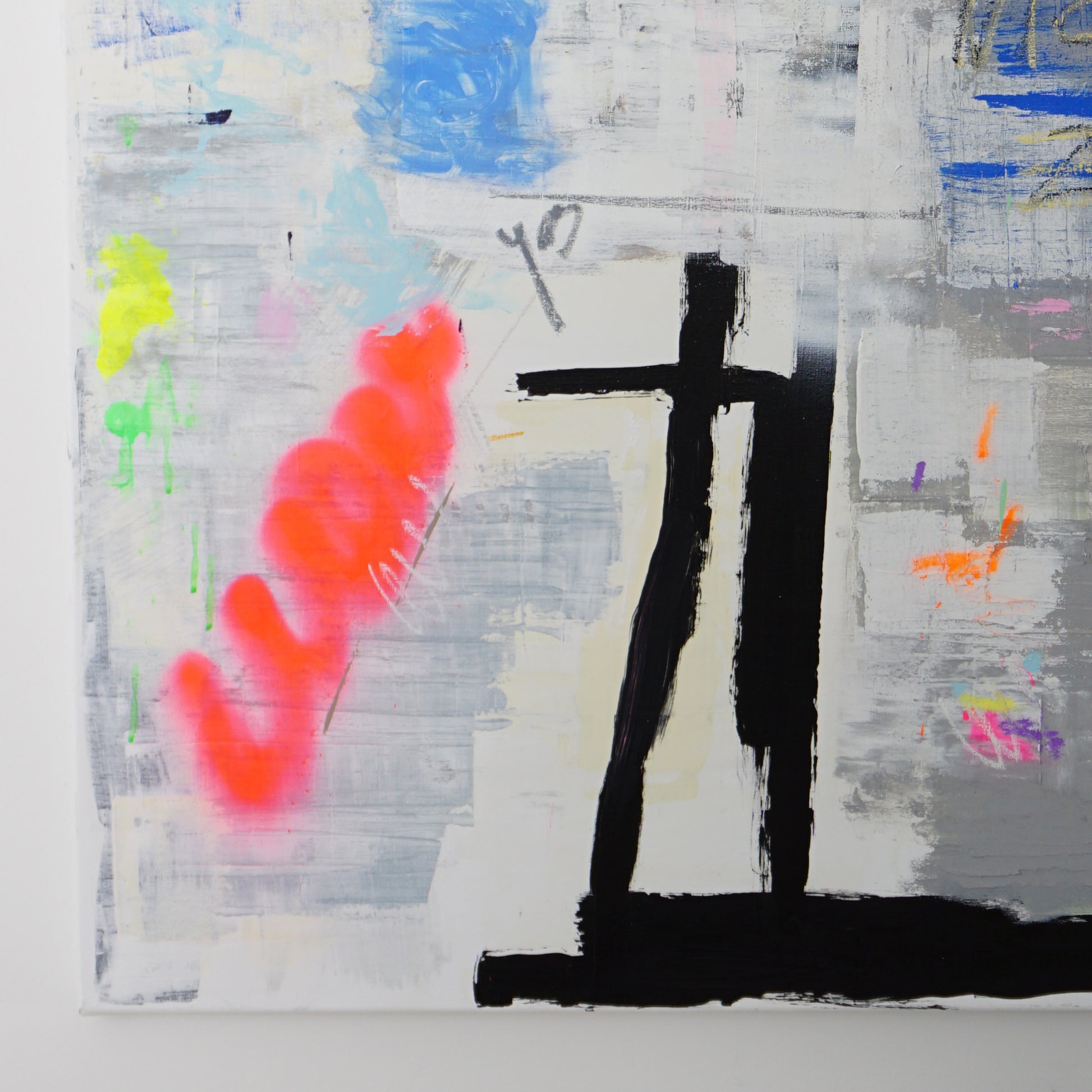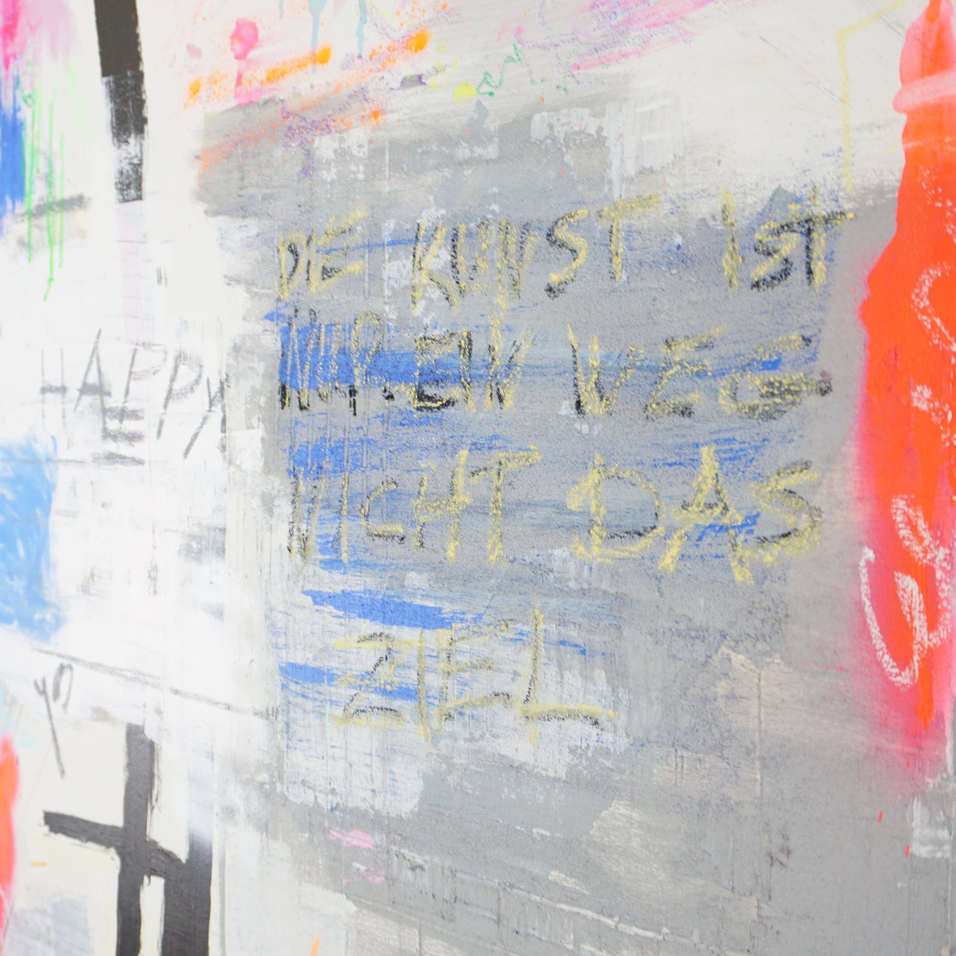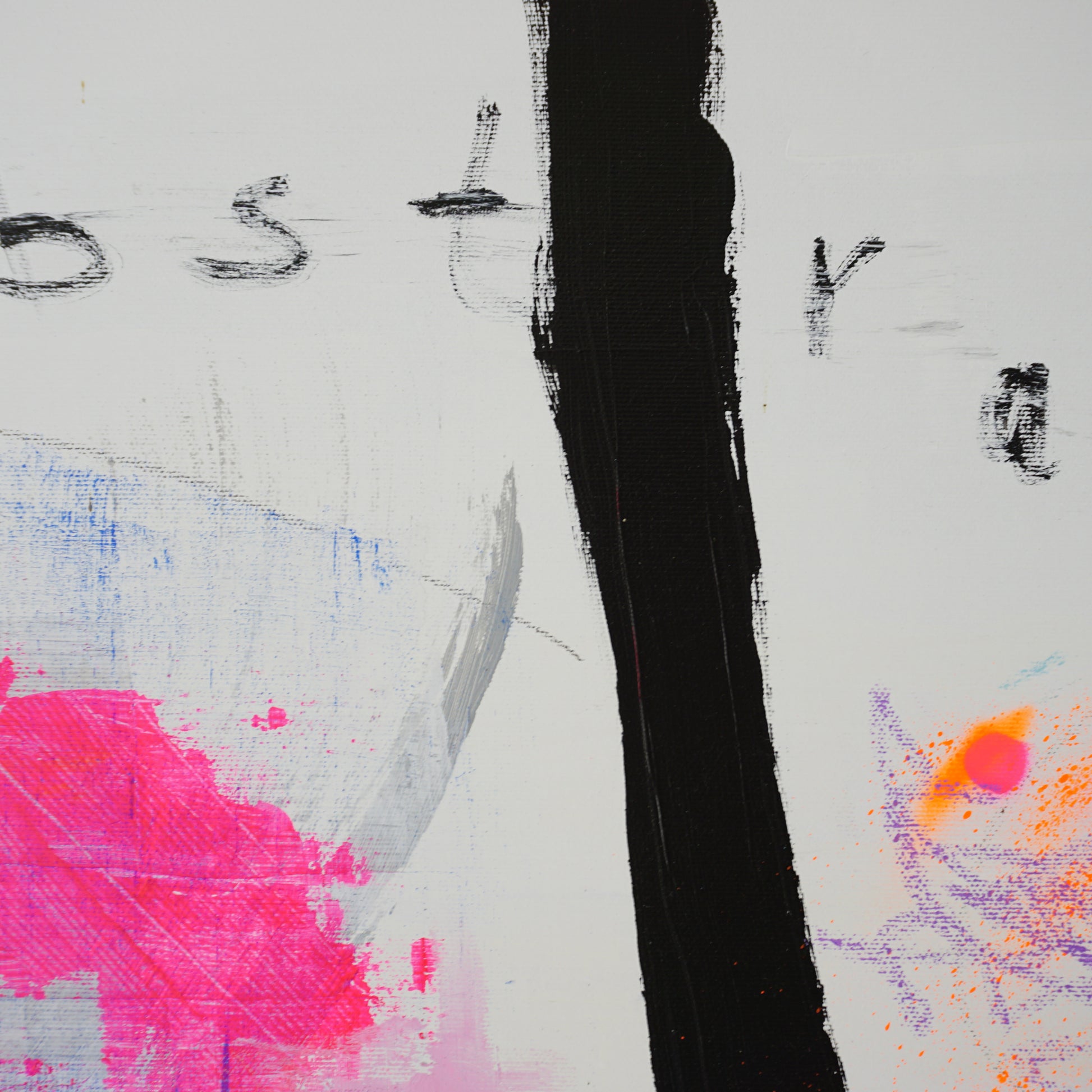 Dieses Werk verbindet urbane Rohheit mit poetischen Notizen. Kräftige schwarze Flächen stehen im Kontrast zu Neonpink, Blau und Grauschichten. Worte wie „Abstract journey“ und „art without boundaries“ laden zur gedanklichen Reise ein – Kunst als unendlicher Erfahrungsraum.