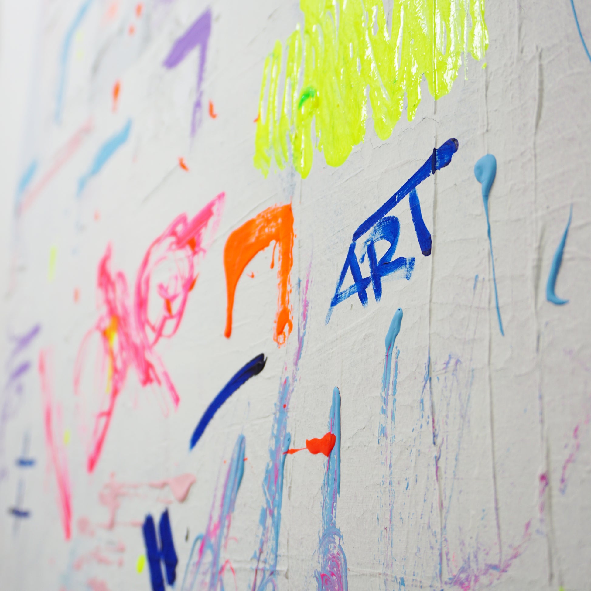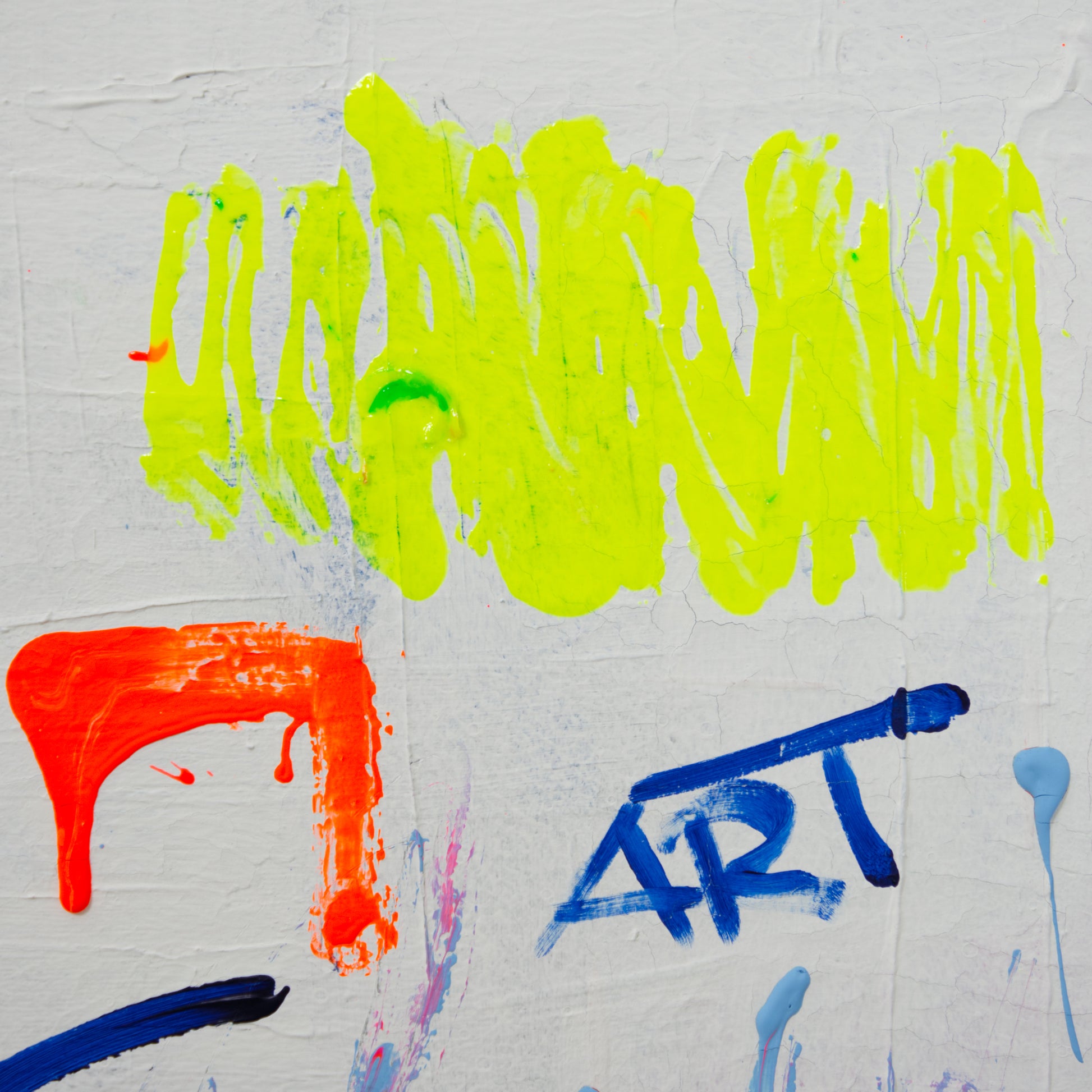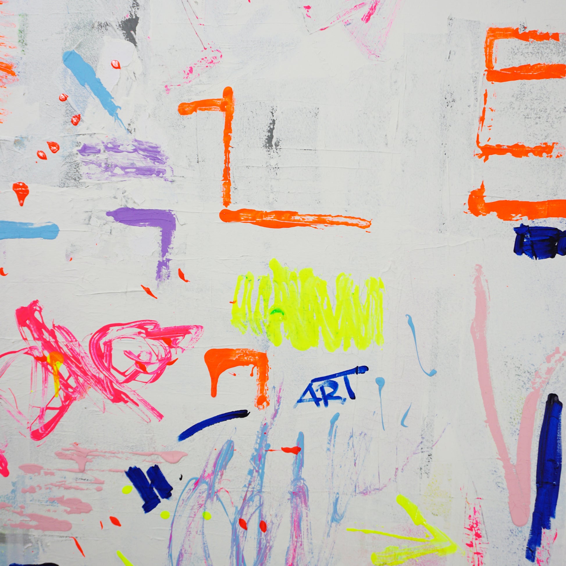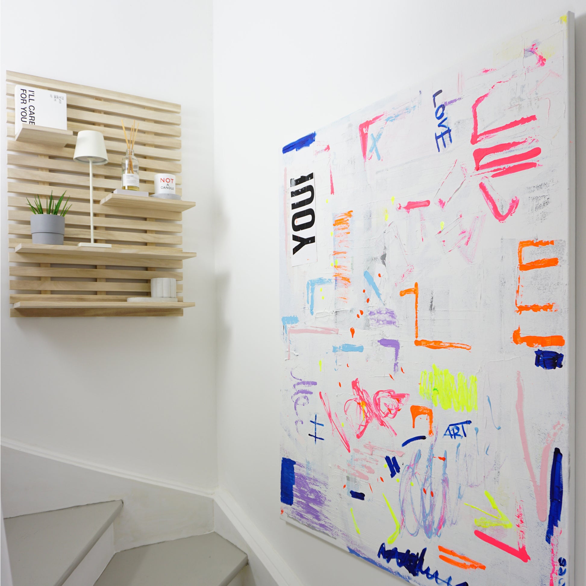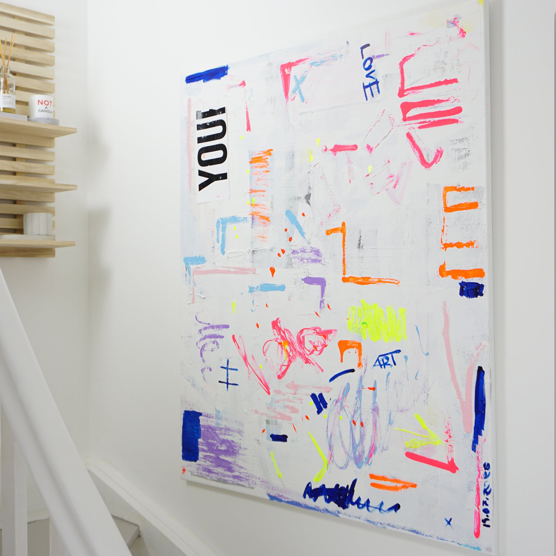 Ein lebendiges, frei komponiertes Bild voller Energie. Neonpink, Gelb und Blau tanzen über eine helle Grundfläche. Der Schriftzug „YOU!“ macht das Werk persönlich und direkt – ein Spiegel für den Betrachtenden.