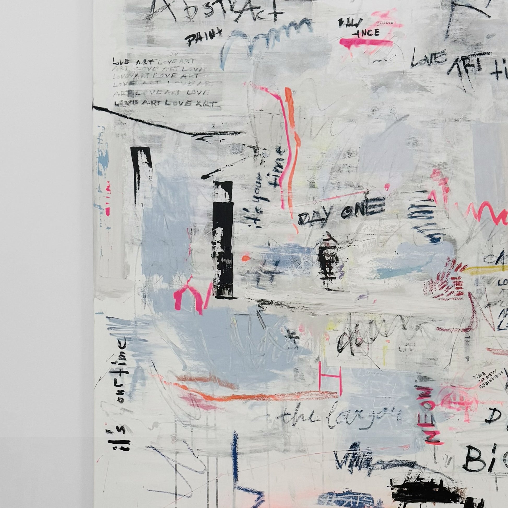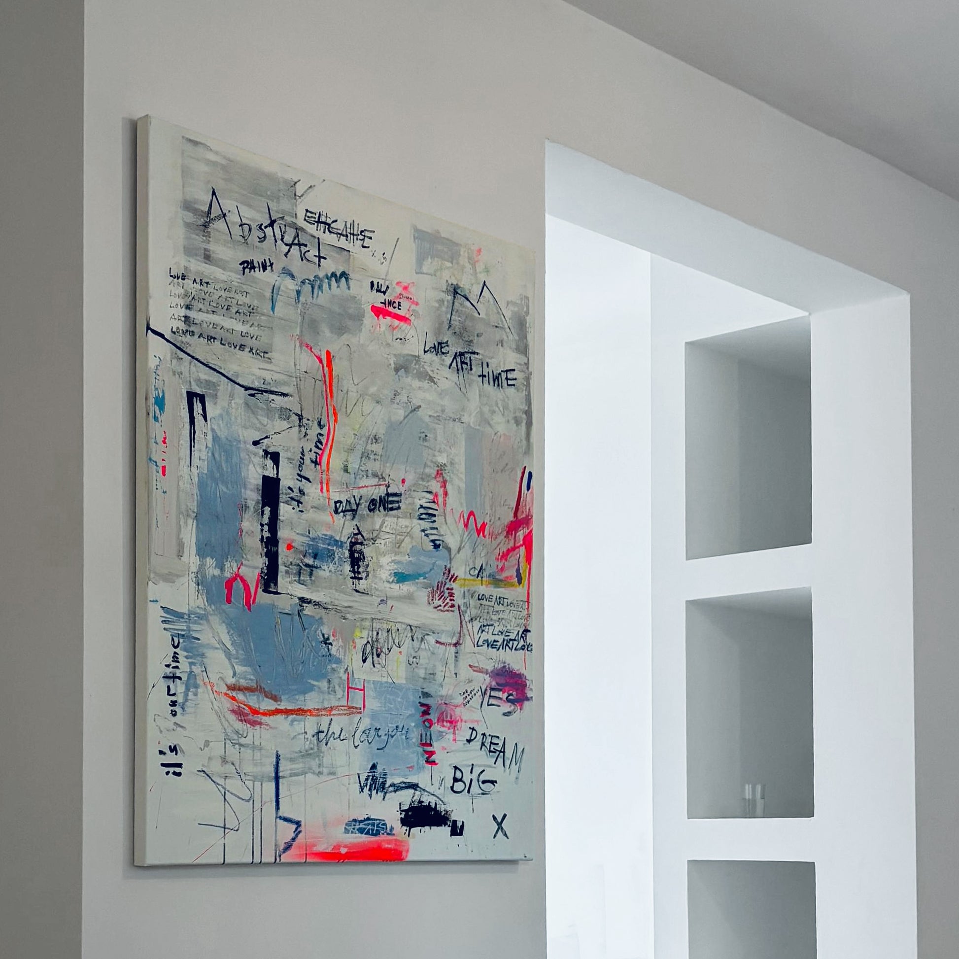 Ein vielschichtiges Werk, das Malerei und Text miteinander verbindet: Auf einer grauen und weißen Basis tauchen handschriftliche Worte und Skizzen auf – LOVE ART TIME, DAY ONE, DREAM BIG. Neonpinke und rote Akzente durchbrechen die ruhige Farbfläche und verleihen dem Bild Dynamik. Eine kraftvolle Mischung aus Street-Art-Energie und abstrakter Malerei, die Gedanken, Emotionen und Spontaneität sichtbar macht.