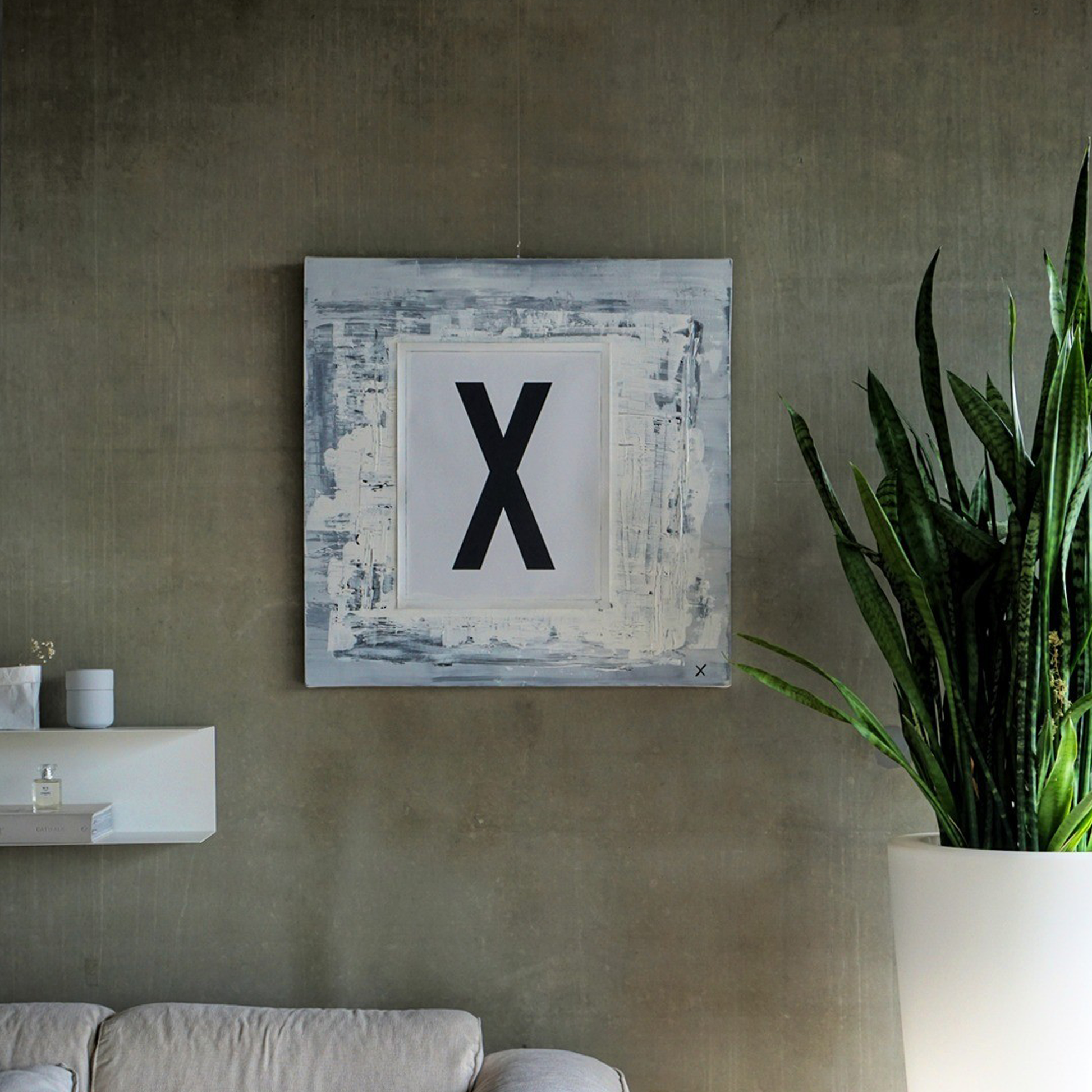 Das ikonische Motiv: Ein großes schwarzes „X“ dominiert die Mitte, eingebettet in einen grauweißen, strukturierten Hintergrund. Reduziert, direkt und markant – ein Werk, das Symbolkraft und Minimalismus in einem vereint.