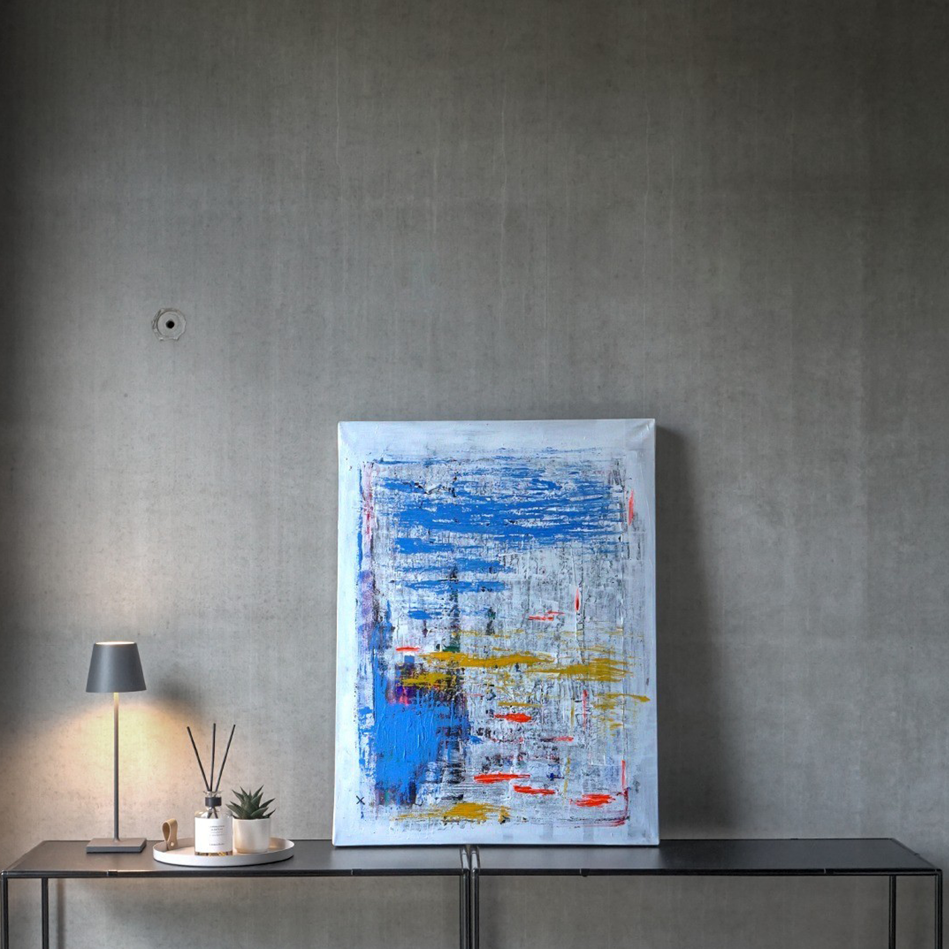 Kühle Blautöne, warme Gelbtöne und feurige rote Spuren verweben sich auf einer strukturierten Oberfläche. Die Komposition erinnert an Wasser, Himmel und Landschaft – abstrakt und doch voller Naturassoziationen. Ein Bild von Ruhe und Energie zugleich.