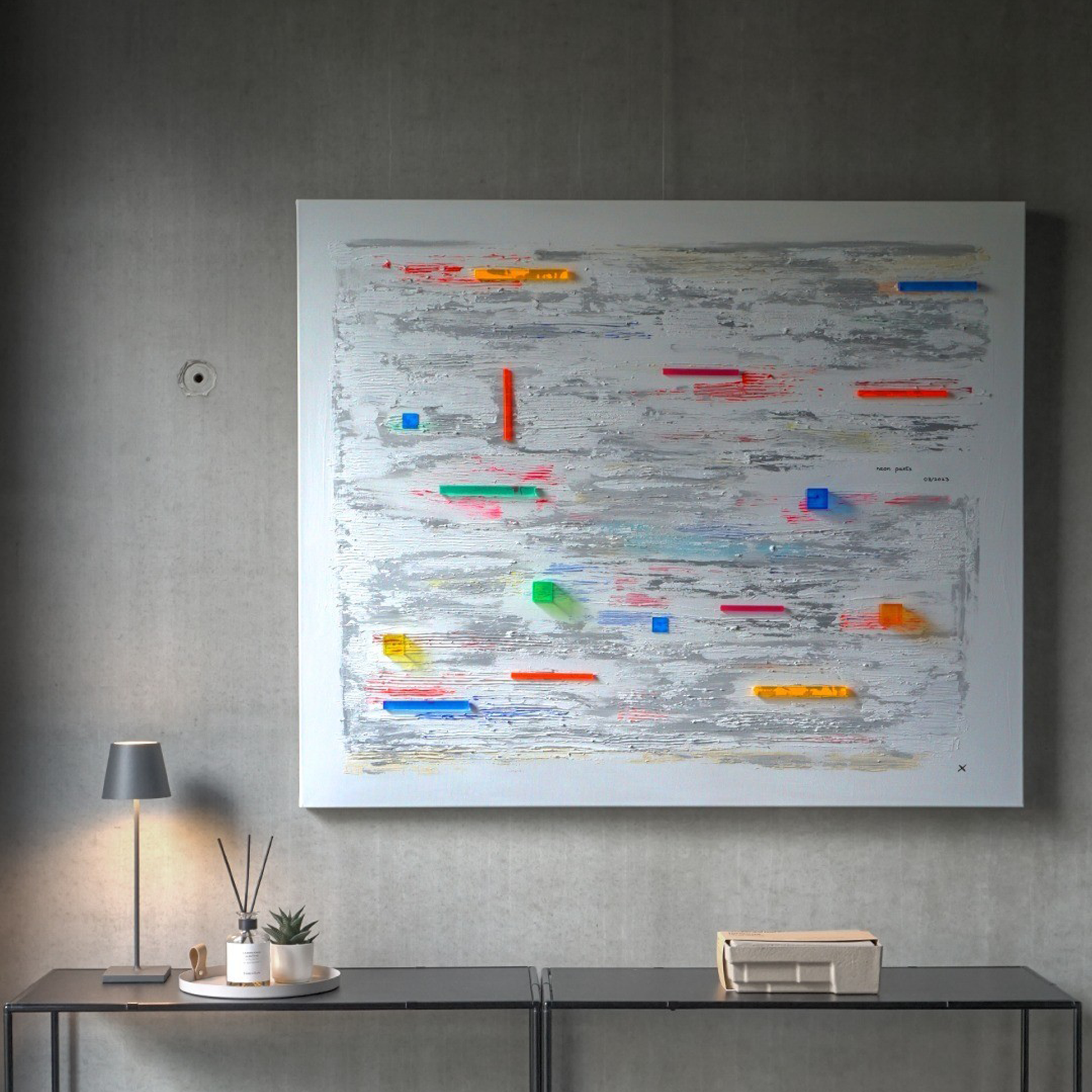 Ein monumentales Bild, das mit Rhythmus und Farbe spielt. Zahlreiche Neon-Elemente in Blau, Grün, Gelb, Orange und Pink schweben über einer strukturierten grauen Fläche. Ein Werk, das wie eine leuchtende Partitur wirkt – kraftvoll und modern.