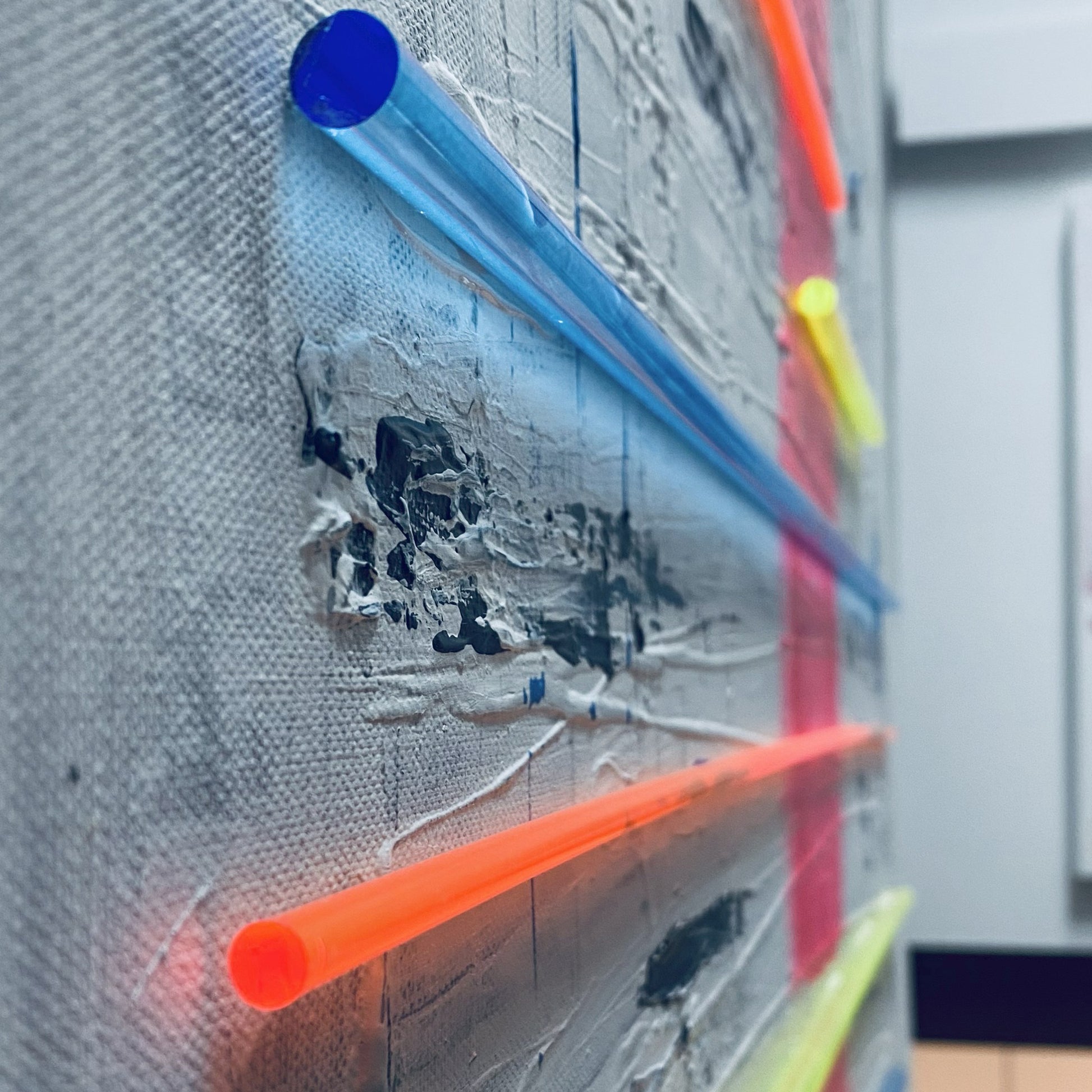 Ein Zusammenspiel von Malerei und Objektkunst: Die strukturierte, grau-weiße Fläche wird durch einen leuchtenden vertikalen Neonpink-Balken dominiert. Ergänzt wird er durch eingearbeitete horizontale Acrylstäbe in Gelb, Orange und Blau, die plastisch aus der Leinwand treten. Diese Kombination aus Farbe, Struktur und Objekt verleiht dem Werk eine außergewöhnliche Tiefe – ein urbanes Statement zwischen Malerei und Skulptur.